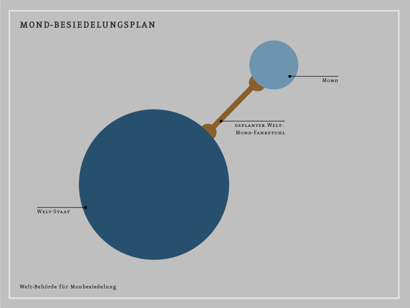 Die Welt-Behörde für Mondbesiedelungsprogramm sucht Mittel und Wege den seit den 60er Jahren geplanten Welt-Mond-Fahrstuhl zu bauen. Die Erschließung von neuem Lebensraum im All ist ihr oberstes Ziel.